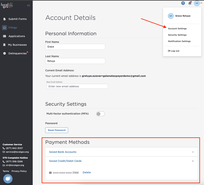 - Under Payment Methods, select Saved Bank Accounts or Saved Credit/Debit Cards.