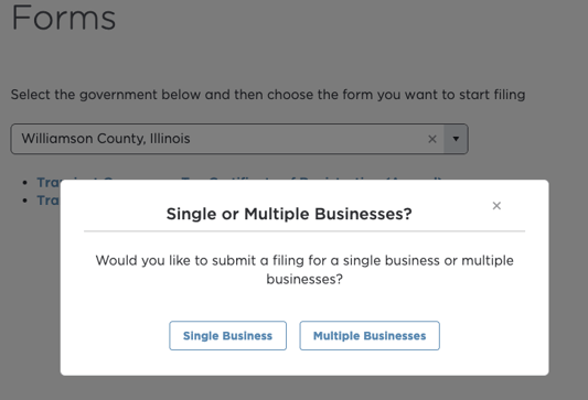 Bulk filing in Localgov is available only for select forms. If a form supports it, you’ll see the option to submit for either a single business or multiple businesses when opening the form. This feature is especially helpful for business owners with multiple locations or for accountants managing filings for several clients.