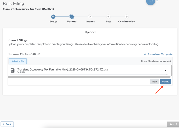 - Go to the Next page, click Select a file. Choose your completed template and then click Upload.