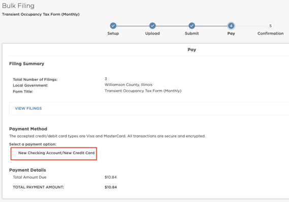 - Select and enter your payment method to finish your bulk filing and submit your payment.